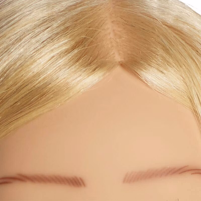 Ett ljusblont träningshuvud med ca 35 cm hårlängd och en fin nyans på nivå 9. Håret består av 80 % äkta hår och 20 % jak-hår, vilket ger en extra lätt och flexibel textur som är utmärkt att styla. Eftersom håret är implanterat från hjässan faller det naturligt och gör det möjligt att arbeta precist med klippning, färgning och föning, liksom med inrullningstekniker, fingerwaves eller luggarbeten. Ett ljusblont övningshuvud som ger realistiska resultat.